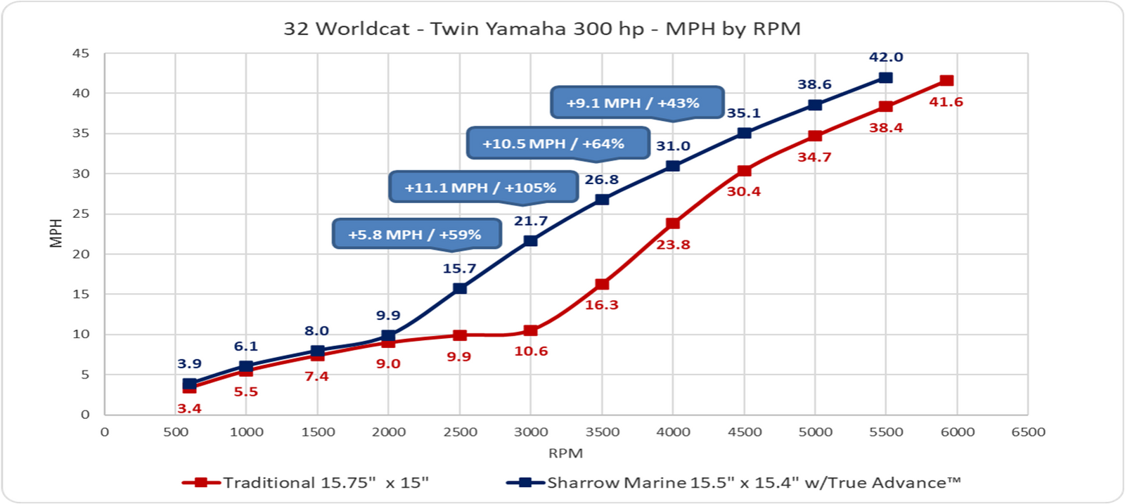 Sharrow’s True Advance™ design also results in faster speeds at the same engine RPM. Cruise at the same speed at a much lower RPM or cruise up to 10 MPH FASTER at the same RPM. The choice is yours!