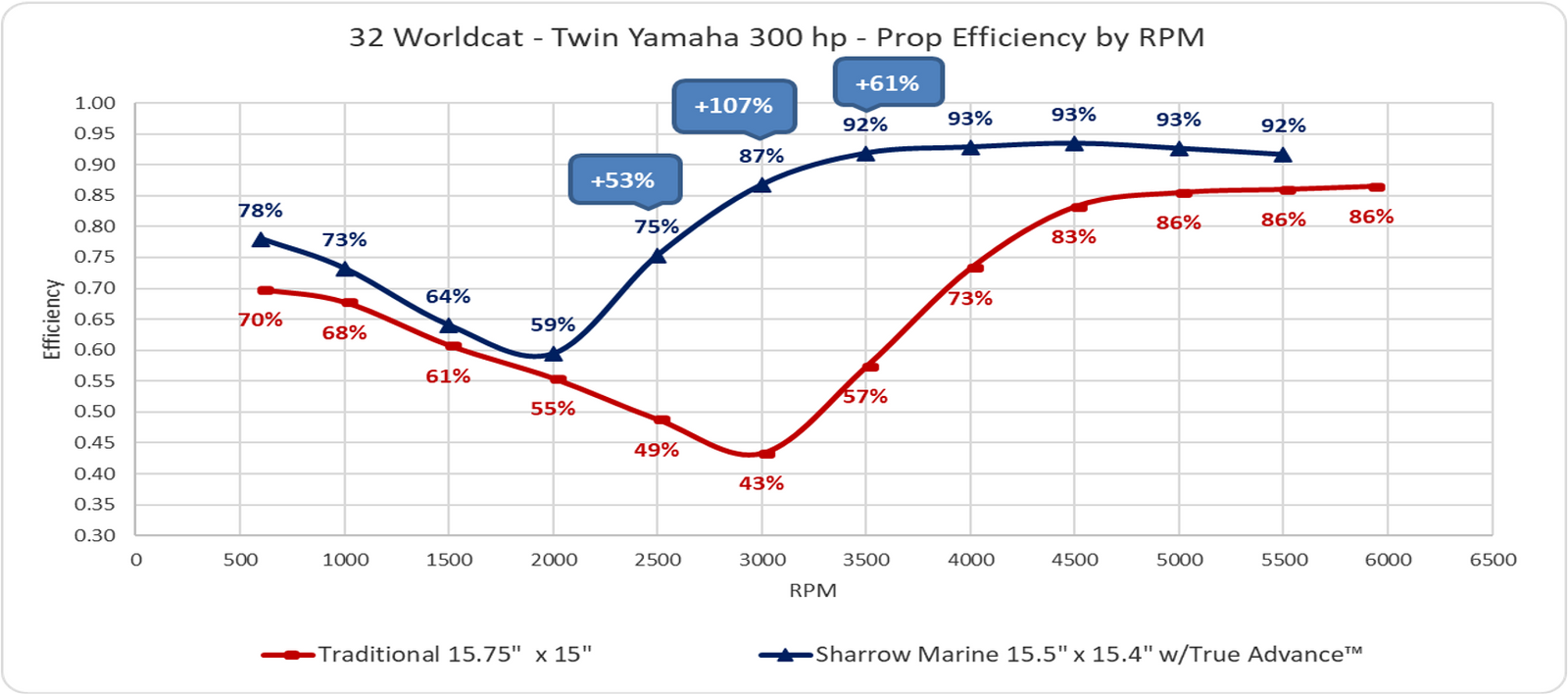 Sharrow’s True Advance™ Delivers 97+% of maximum efficiency as soon as the boat reaches planing speed